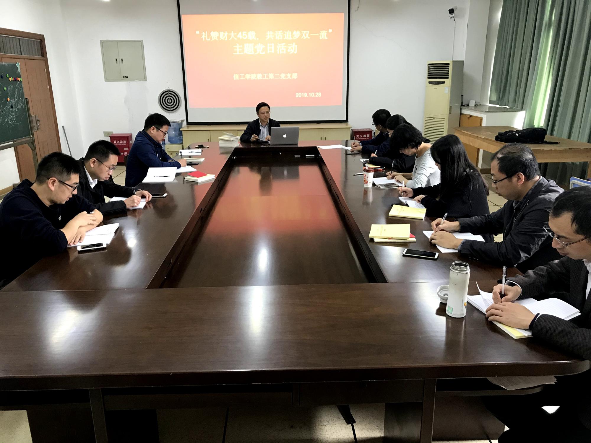 10月28日下午,教工第二党支部在9-305召开了“礼赞财大45载,共话追梦双一流”主题党日活动。