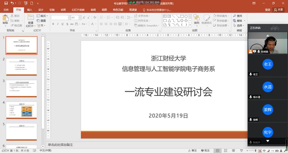 本次研讨会通过腾讯会议系统在线举行,陈明晶首先详细解读了《电子商务类专业教学质量国家标准(2018版)》和《高等学校社科类专业认证通用标准(2019版)》两份文件,认真分析了专业建设的总目标和主要任务,并针对本专业的现状,列举了当前专业建设中存在的问题,提出了改进思路和下一步的建设方案等。与会教师也纷纷就专业培养方案、课程建设、毕业设计、教学实践等环节,分享了经验,交流了看法,对一流专业建设的后续工作了有进一步的认识。