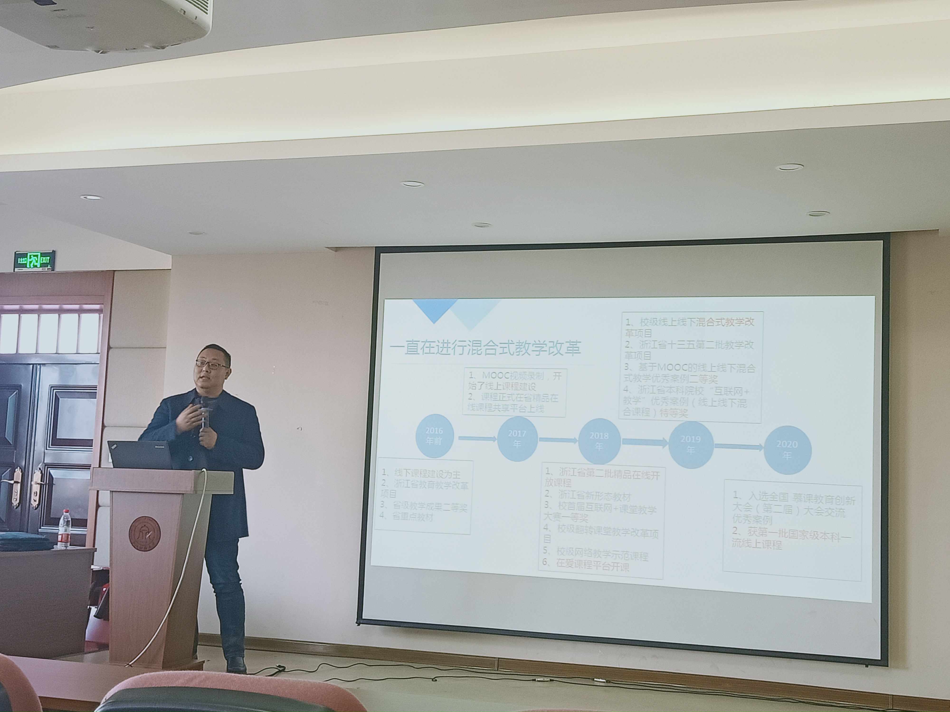 会上,叶舟老师结合自身教学体会以及课程建设经验,作了题为《ERP模拟演练教学改革及金课建设》的专题报告。他以自己主持的国家级一流课程《ERP模拟演练》为例,阐述了一流课程建设背景,详细介绍了如何贯彻以学生为中心的教学理念,如何利用智慧教学工具来开展混合式教学,并总结了国家级与省级各类一流课程建设进度以及我校各类课程建设项目的相关进度,最后还重点强调了课程“两性一度”的提炼、“课程思政”等项目申报中需要注意的重点问题。与会老师踊跃发言,开展了充分而深入的互动交流,会场气氛热烈。