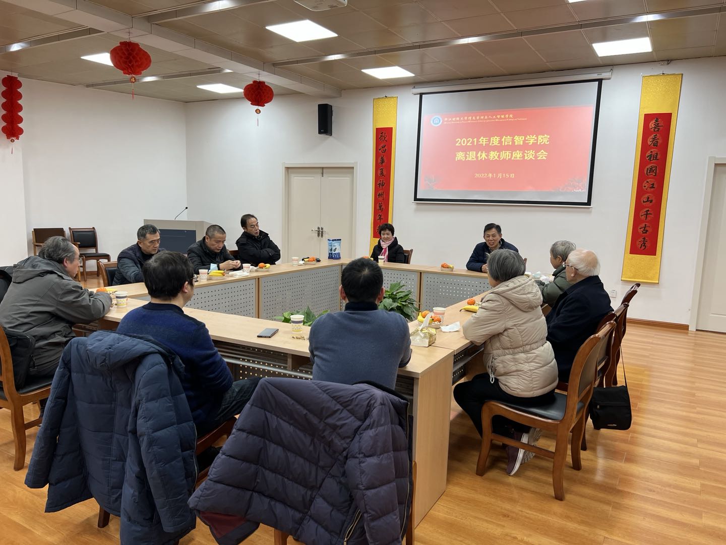 1月15日下午,学院院长张帅、党委书记徐奇伟、工会主席章华和办公室主任徐吉锋与退休教师们在文华校区离退休会议室亲切座谈,提前给他们送上了新年的祝福。