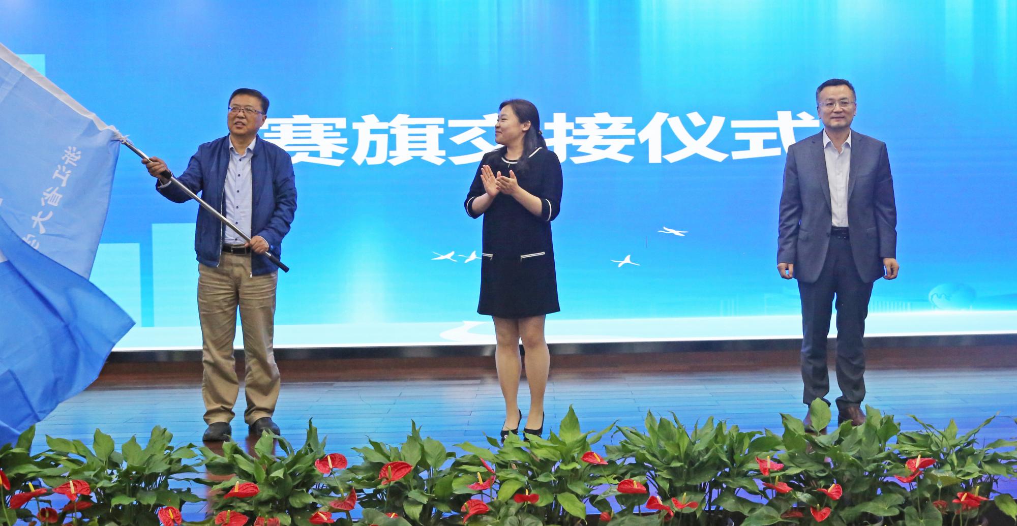 最后,现场举行了赛旗交接仪式,下一届大赛承办单位——宁波工程学院经济与管理学院院长陈洪波接过赛旗。