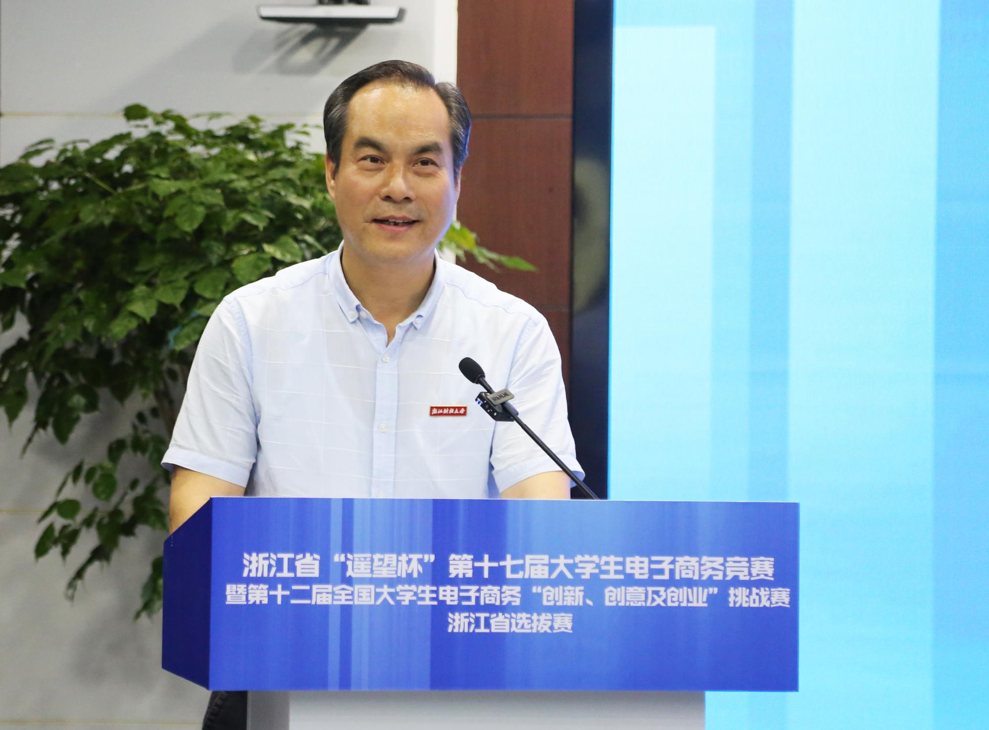 随后,教育部电子商务类专业教学指导委员会副主任章剑林致辞。他高度肯定了本届大赛,代表教育部电子商务类专业教学指导委员会和全国大学生电子商务“三创赛”竞赛组织委员对本届大赛的承办单位、志愿者和全省参赛师生表示感谢,并对所有获奖团队表示热烈祝贺。章剑林指出,此次大赛充分展现了浙江省浓厚的电子商务发展氛围、浙江省高校一流的电商竞赛水平以及参赛师生们的智慧。本届大赛参赛作品涉及范围广,作品主题和创意走在了全国高校前列,打响了浙江“电商军团”品牌。