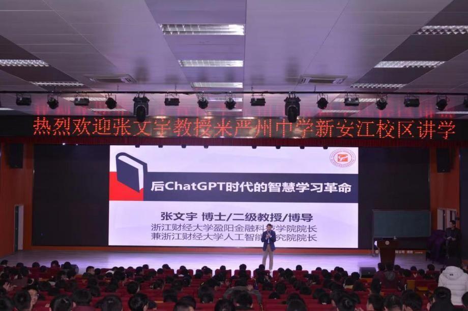 二级教授、博士生导师、盈阳金融科技学院院长兼人工智能研究院院长、浙江省“我最喜爱的高校思政课老师”张文宇走进百年名校——浙江省一级重点中学严州中学。张文宇结合当前热点,为全体高二学生开展了一场主题为《后ChatGPT时代的智慧学习革命》的生涯规划演讲。800人的报告厅座无虚席,连走廊都挤满了学生。张文宇一如既往的“激情才情真情兼备,风趣幽默接地气”的脱口秀式演讲风格使现场欢呼声不断、爆笑全场,收获了20余次掌声。