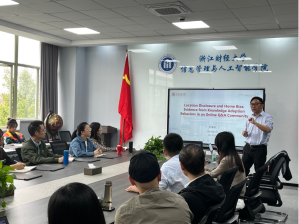 做学术讲座。罗教授分享的主题为“Location Disclosure and Home Bias: Evidence from Knowledge Adoption Behaviors in an Online Q&A Community”。学院副院长隆清琦教授、学院骨干教师、研究生等三十人参加了讲座。讲座由信管系教师王盼盼主持。
