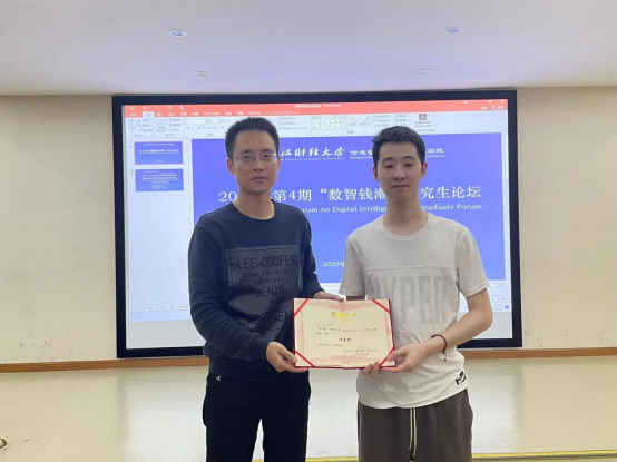 经过点评老师的合议,最终评选出了本期论坛的优秀分享者——胡书逸同学,并由隆清琦副院长亲自为他颁奖。