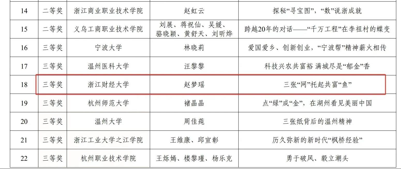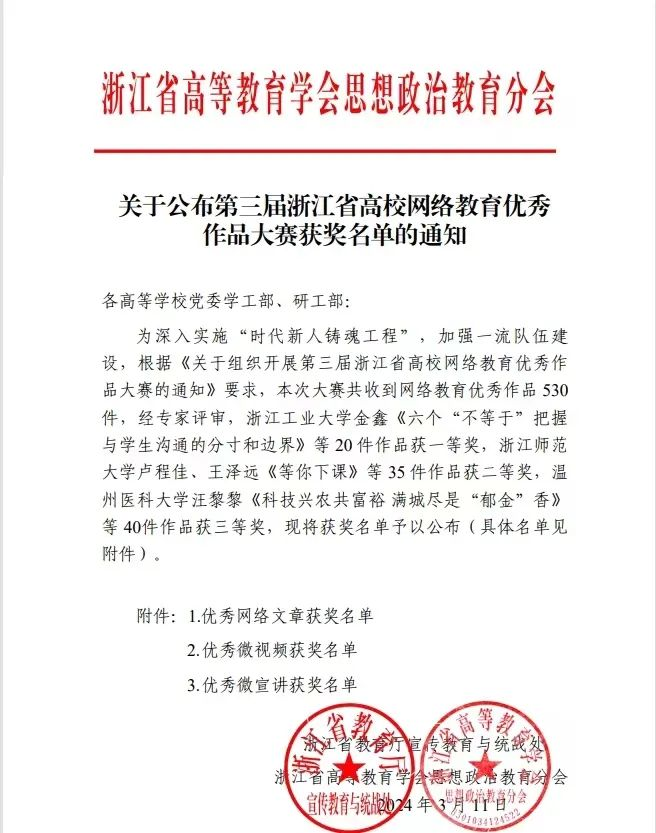 近日,由浙江省教育厅宣传教育处、浙江省高等教育学会思想政治教育研究分会组织开展的第三届浙江省高校网络教育优秀作品大赛获奖名单公布,成人视频 思政辅导员赵梦瑶的作品《三张“网”托起共富“鱼”》荣获优秀微宣讲三等奖。