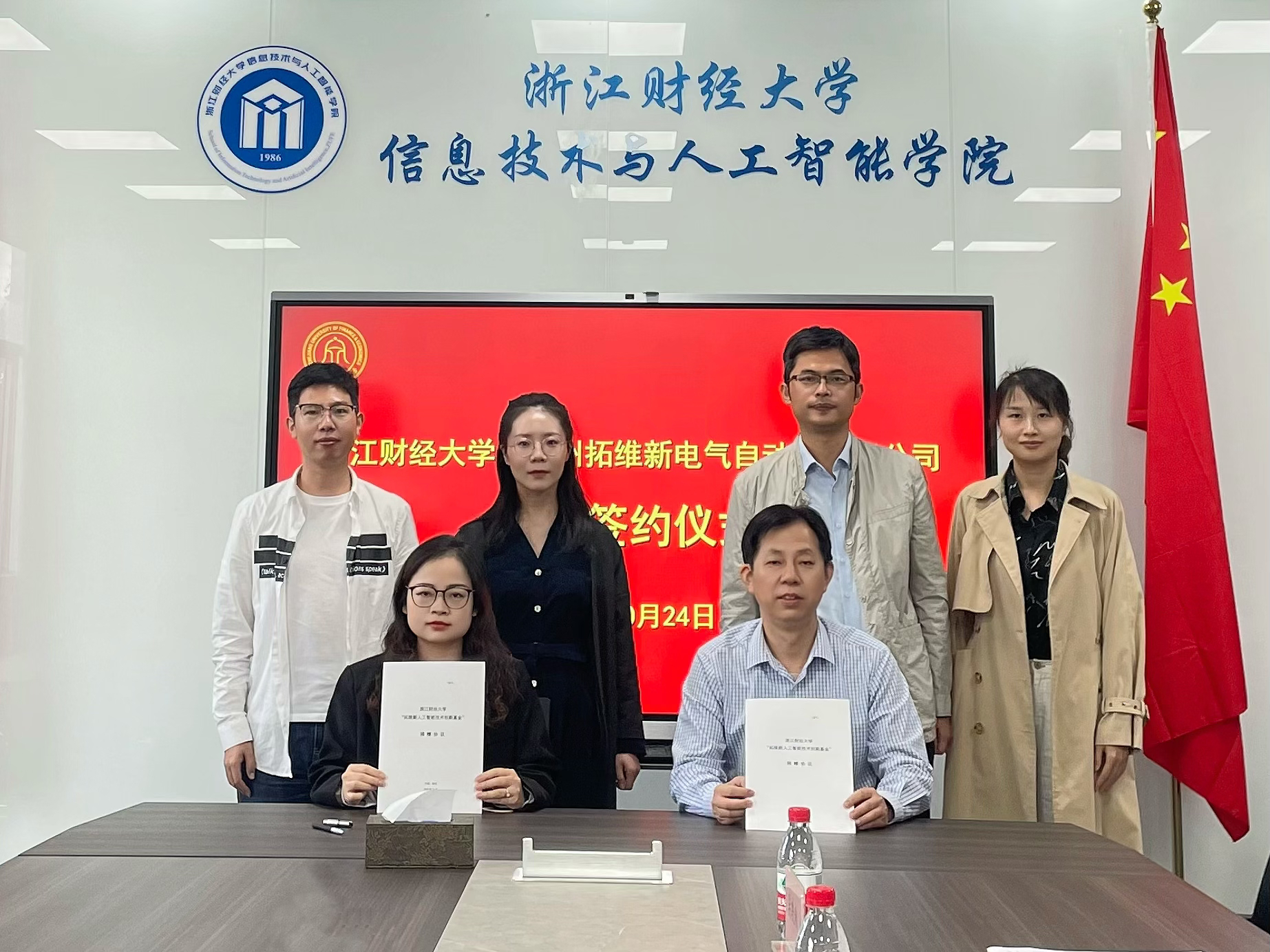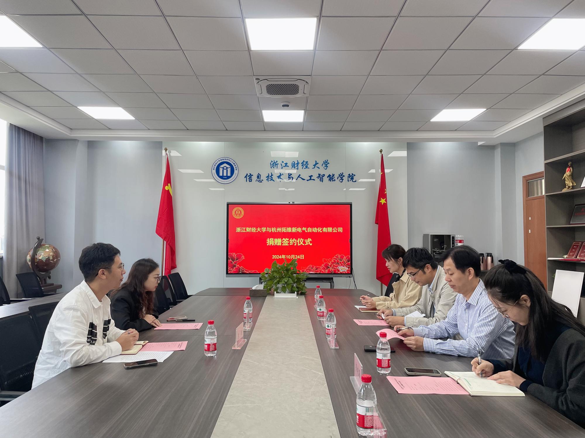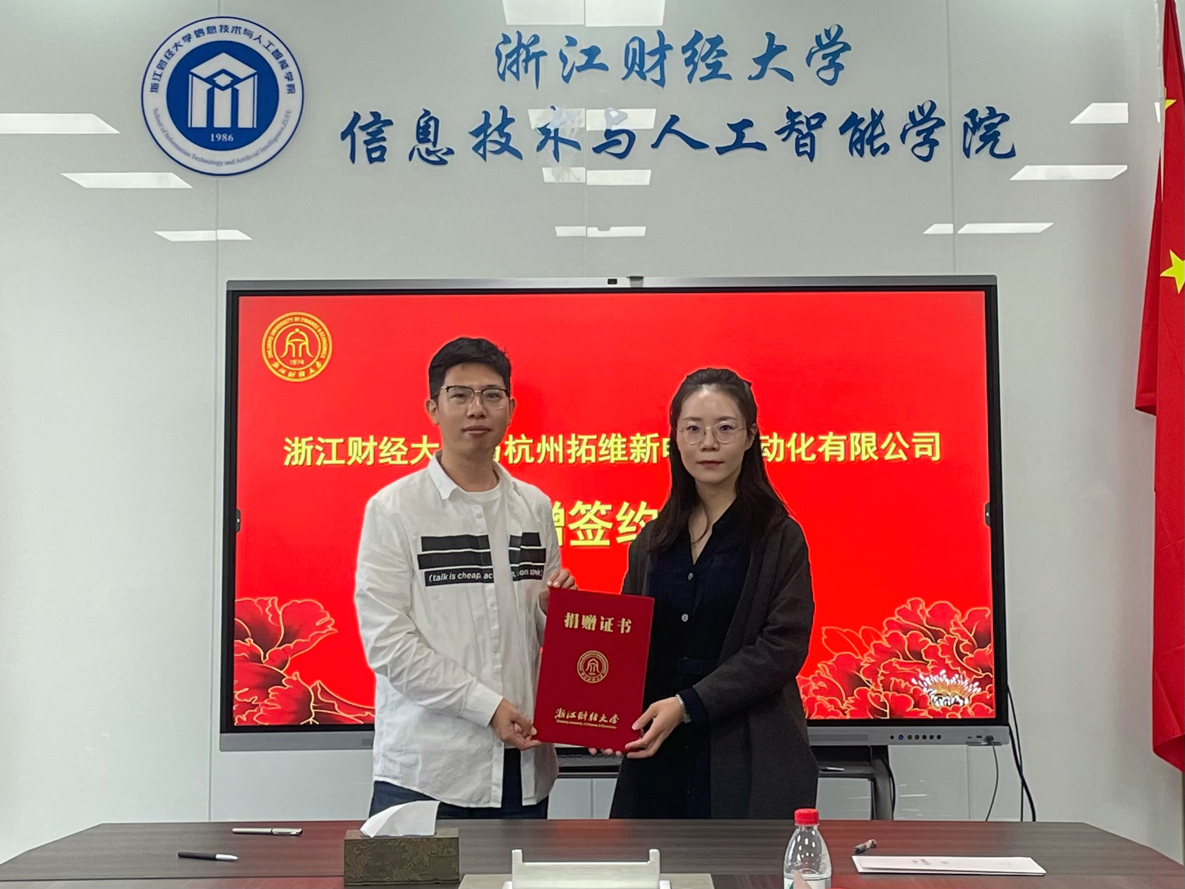 与杭州拓维新电气自动化有限公司举行捐赠签约仪式。杭州拓维新电气自动化有限公司合伙人、学院计算机系教师张翔、副总经理罗春香,校友办副主任韦晓蓓、学院院长张帅、党委书记吴翼泽、党委副书记吴轶韵等出席活动。