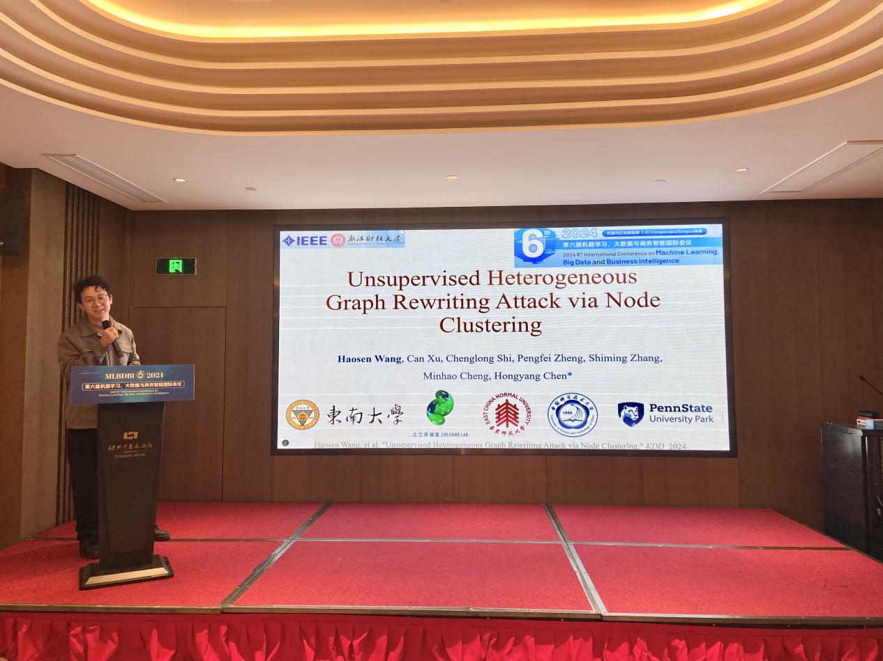 来自东南大学的博士生王浩森和史成龙分别作了主题为“基于节点聚类的异构图重写攻击”“基于知识引导的语义一致序列推荐对比学习”的口头报告。