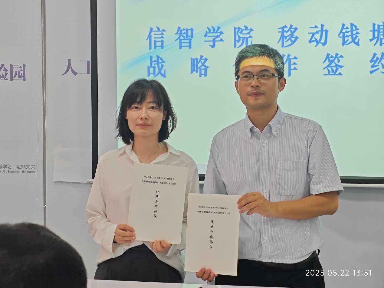 党委书记吴翼泽与中国移动钱塘分公司副总经理乐黎黎代表双方签署战略合作协议,标志着校企合作迈入全方位、多维度发展的新阶段。
