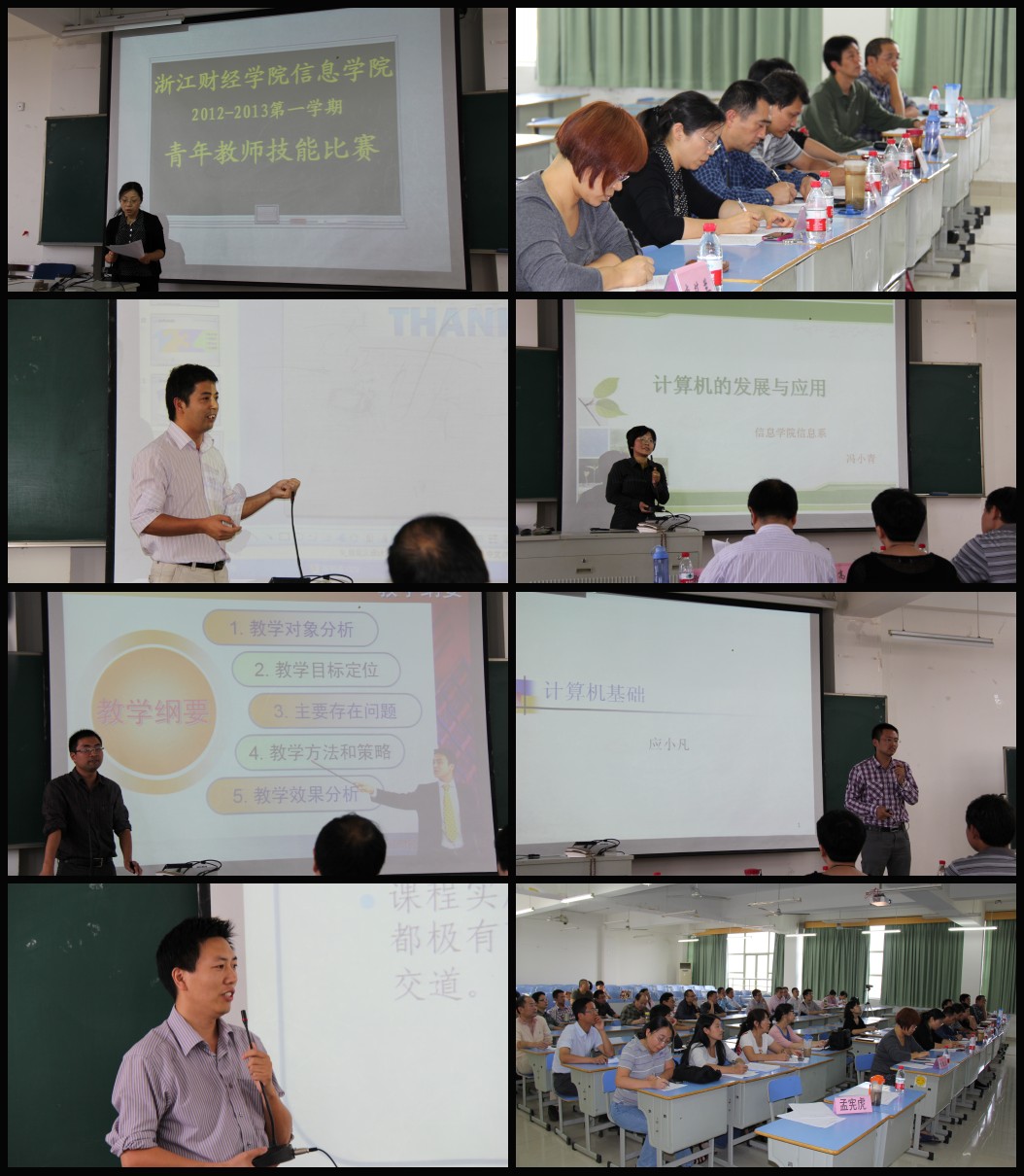 比赛由信息学院教学副院长马雪英老师主持,王衍教授等9位评委对本次比赛进行成绩评定,学院其余老师进行教学观摩。本次比赛共有五位老师报名参加,分别是陈明晶老师,讲授课程为《Internet与网页设计》;冯小青老师,其讲授课程为《计算机基础》;应小凡老师,其讲授课程为《计算机基础》、陈琰宏老师,其讲授课程为《程序设计基础》以及石向荣老师,其讲授课程为《计算机基础》。