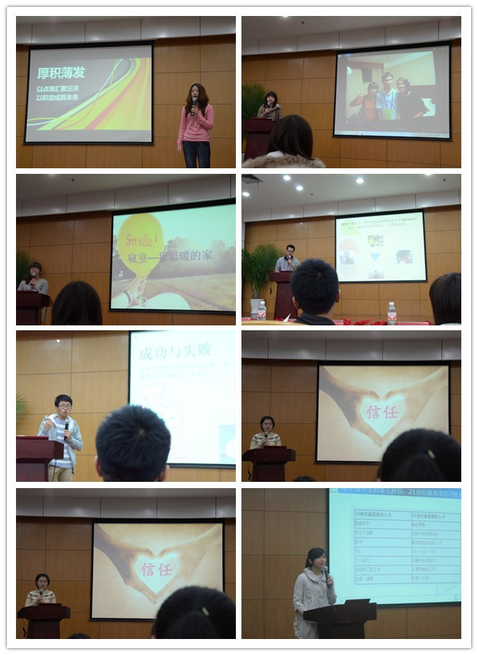 10位选手先后上场给大家带来精彩的分享。以“文明寝室”为主题的同学,分享了他们文明寝室建设的历程和经验,图文并茂展示了他们“和谐友爱一家亲”的寝室文化氛围,干净、整洁的寝室,真实、丰富的寝室生活剪影,让大家深入感受到文明寝室就在身边。以“志愿服务”为主题的同学,以视频形式分享了他们镜头下可亲可爱的志愿服务团队及从事志愿服务以来一次次用实际行动践行感恩奉献的点点滴滴,让在场的每一位师生真切感受到了奉献之美;以“名书品读”为主题的同学,带我们走进了经典的知识海洋,一个个鲜活的人物形象在脑海中活现,让我们感受到了书本是我们不可多得的良师益友。以“大学生学习规划”为主题的同学更是通过自己独特的视角分析了大学生普遍的生活现状及对未来的思考与规划,情真意切发人深省。以“学科竞赛”为主题的同学,讲述了一个个平凡学子不断追求竞赛梦想的成长历程,真挚朴实的语言也鼓舞着在场每一个有梦的信息学子,克服困难勇攀高峰。