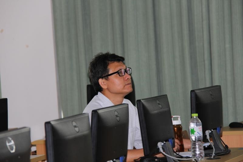 张文宇教授怕同学们独自解决不熟悉的问题会很困难,体贴的在课下时间来到教室为同学们解决问题。图为同学们认真的听张教授的讲解。