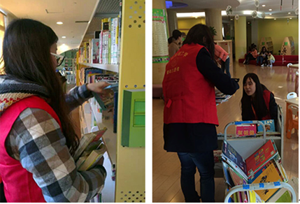 一大早,志愿者们在学校统一集合出发,经过两小时的公交车程,到达杭州少儿图书馆,与工作人员进行了短暂的交接之后,便开始了一天忙碌的工作。在这里,他们是书本的搬运工;在这里,他们是来借阅图书人眼中的可以求助的人;在这里,他们是童真孩子眼中的哥哥姐姐。当看到孩子们找到心仪的书本时,那稚气的笑脸,志愿者们知道“一切都值得”。当看到年迈的老人为孙子借到满意的书籍时,那一声声诚挚的感谢声,让志愿者们内心温暖,因为那不仅仅是一个老人对孩子的疼爱,更是对我们志愿者工作的肯定。因为有这些感动,支持者志愿者们,一路前行。