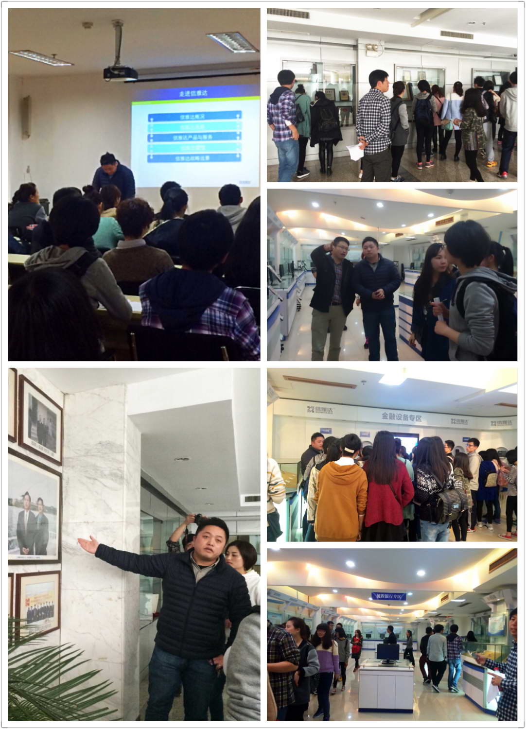 到达信雅达总部大楼后,同学们首先参观了位于二楼的产品展示厅,公关部徐经理向同学们介绍了信雅达的主要软件产品和主营业务,使同学们对信雅达有了直观的了解和认识。