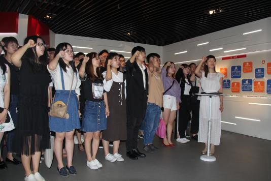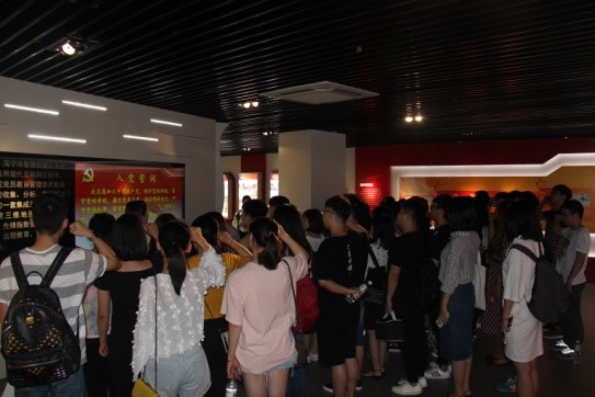 参观学习的一项重要内容是举行庄重的宣誓仪式。毕业生党员面向宣誓墙,在老师的带领下重温入党誓词,每一句誓言都催人奋进,每一句掷地有声的誓言激励着毕业生党员们跟随党的指引坚定地前行。