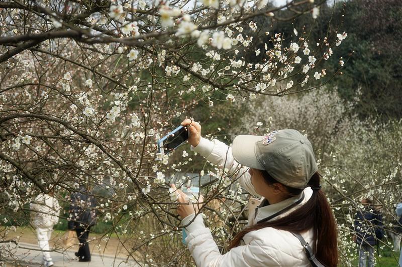 “众芳摇落独暄妍,占尽风情向小园。”众花凋零,唯有梅花迎着寒风傲然盛开,占尽了小园的景色风光。白色的梅花似美丽的闺中秀女,温婉典雅,亭亭玉立;红色的梅花像娇俏的山间精灵,活泼好动,热情洋溢。大家穿梭在这梅林之中,似是被如此这般美好的景色感染,不知不觉放缓了脚步,放低了声音,生怕打扰到这如诗如画的美丽景色。