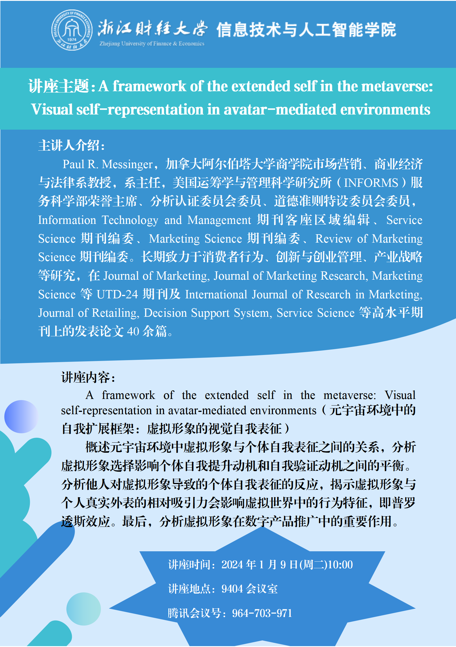 “数智钱潮”讲座系列预告| A framework of the extended self in the metaverse: Visual self-representation in avatar-mediated environments