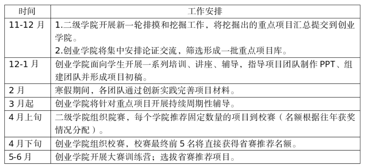 2026年大赛总体时间安排为2025年11月—2026年10月,由项目挖掘、参赛报名、项目打磨、校赛决赛、省赛备赛、国赛备赛六个环节组成。时间线如下: