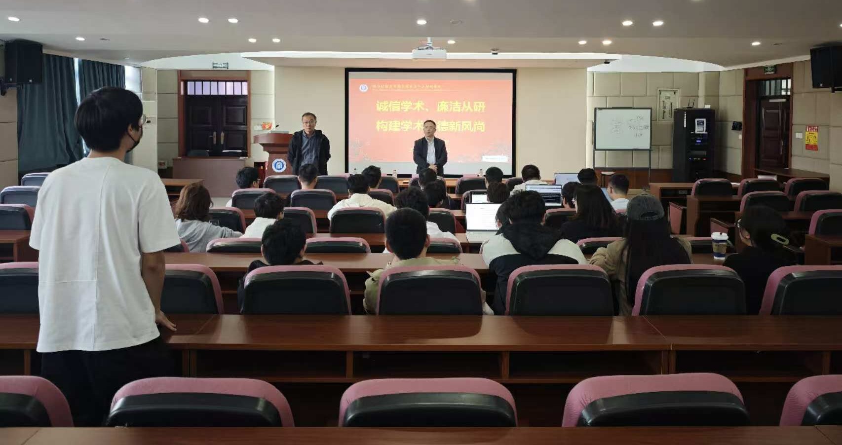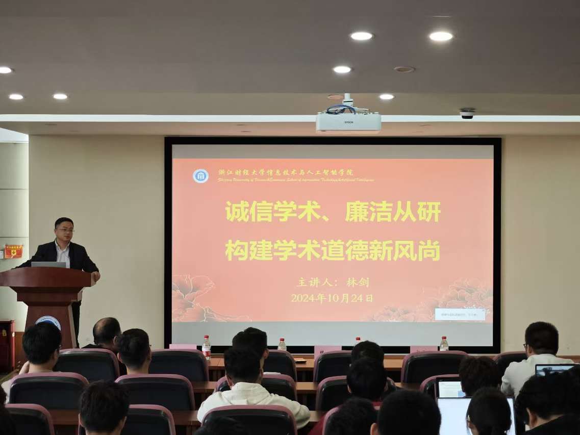 在9302会议室成功举办了主题为“诚信学术、廉洁从研—构建学术道德新风尚”的专题讲座。此次讲座由学院副院长林剑担任主讲人,特邀教授姚建荣,研究生秘书杨天亦,辅导员吴泽勇及2024级研究生参加本次活动。