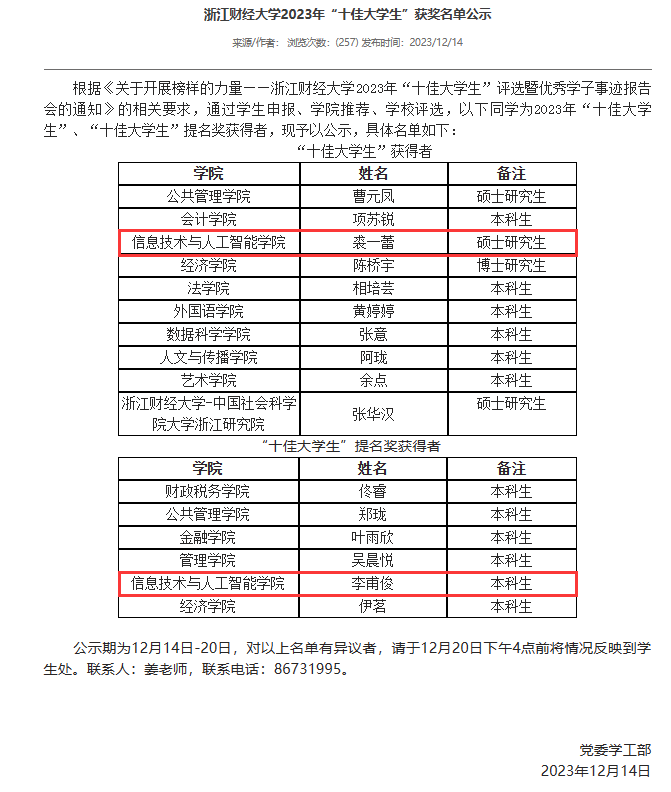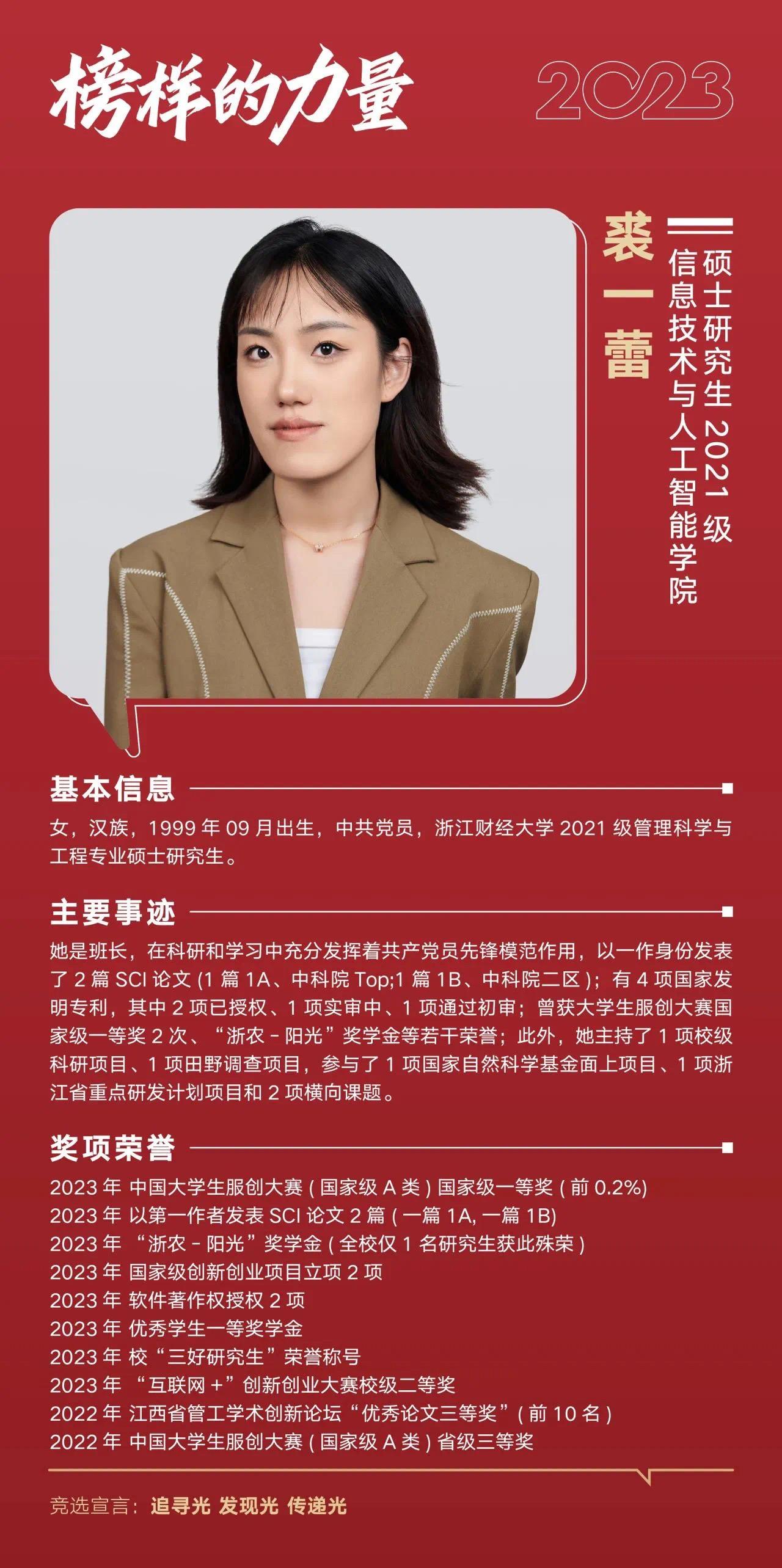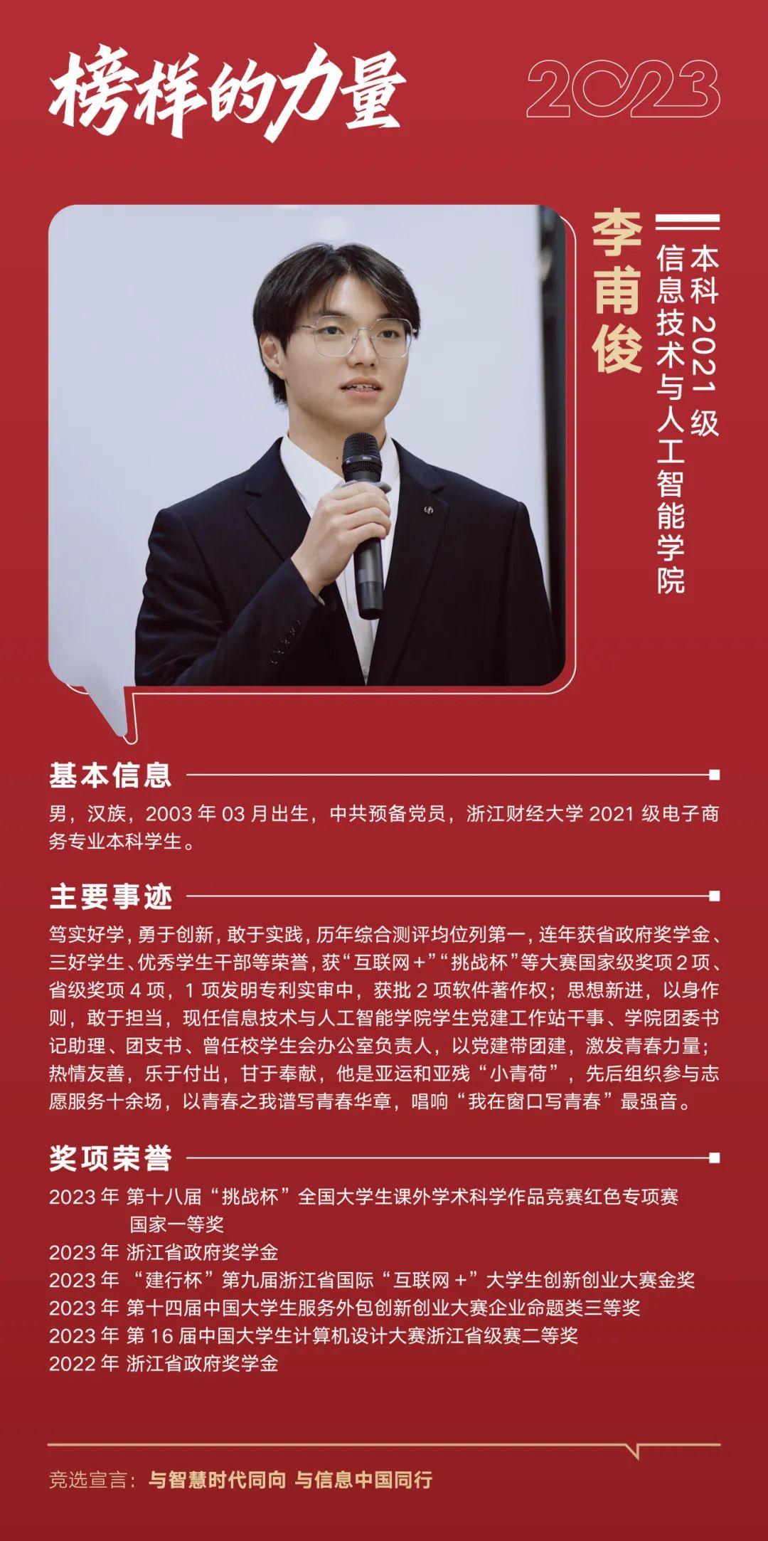 裘一蕾获评2023年“十佳大学生”,李甫俊获评2023年“十佳大学生”提名奖。