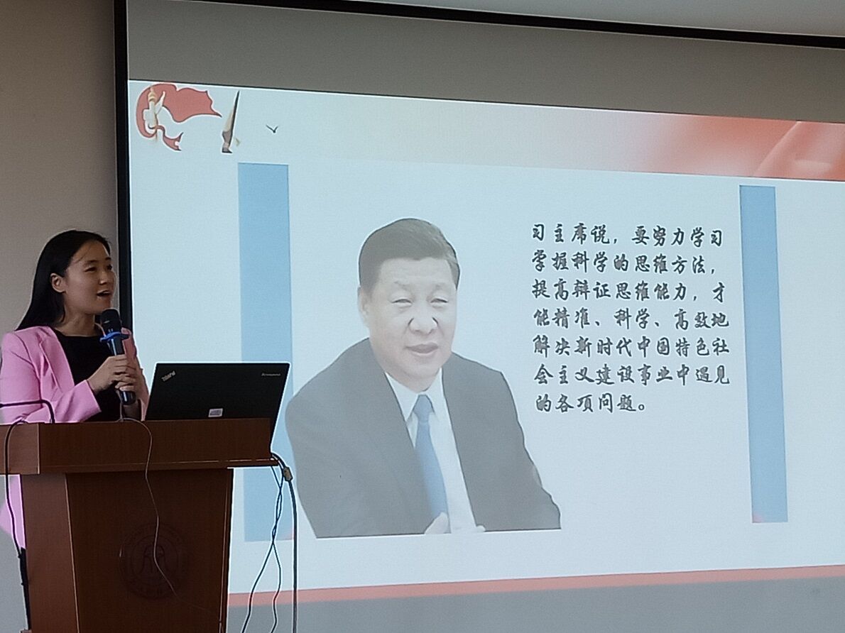会上,朱凌老师围绕“四个讲清”给支部全体党员上了一堂主题鲜明、内涵深刻的党课。朱凌老师指出守初心,就是要牢记全心全意为人民服务的根本宗旨;担使命,就是要牢记我们党肩负的实现中华民族伟大复兴的历史使命。同时,老师还引用了习主席所说的话“要努力学习掌握科学的思维方法,提高辩证思维能力,才能精准、科学、高效地解决新时代中国特色社会主义建设事业中遇见的各项问题。”