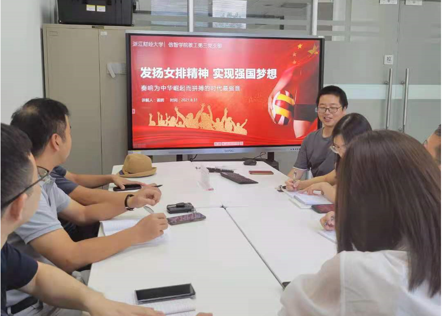东京奥运会中国女排出局,但女排精神永不磨灭。2021年831日,信息管理与人工智能学院教工第三党支部在9301D开展“发扬女排精神,实现强国梦想”主题党日活动,会议由杨水清主持,姜辉做主题报告,支部党员参加。