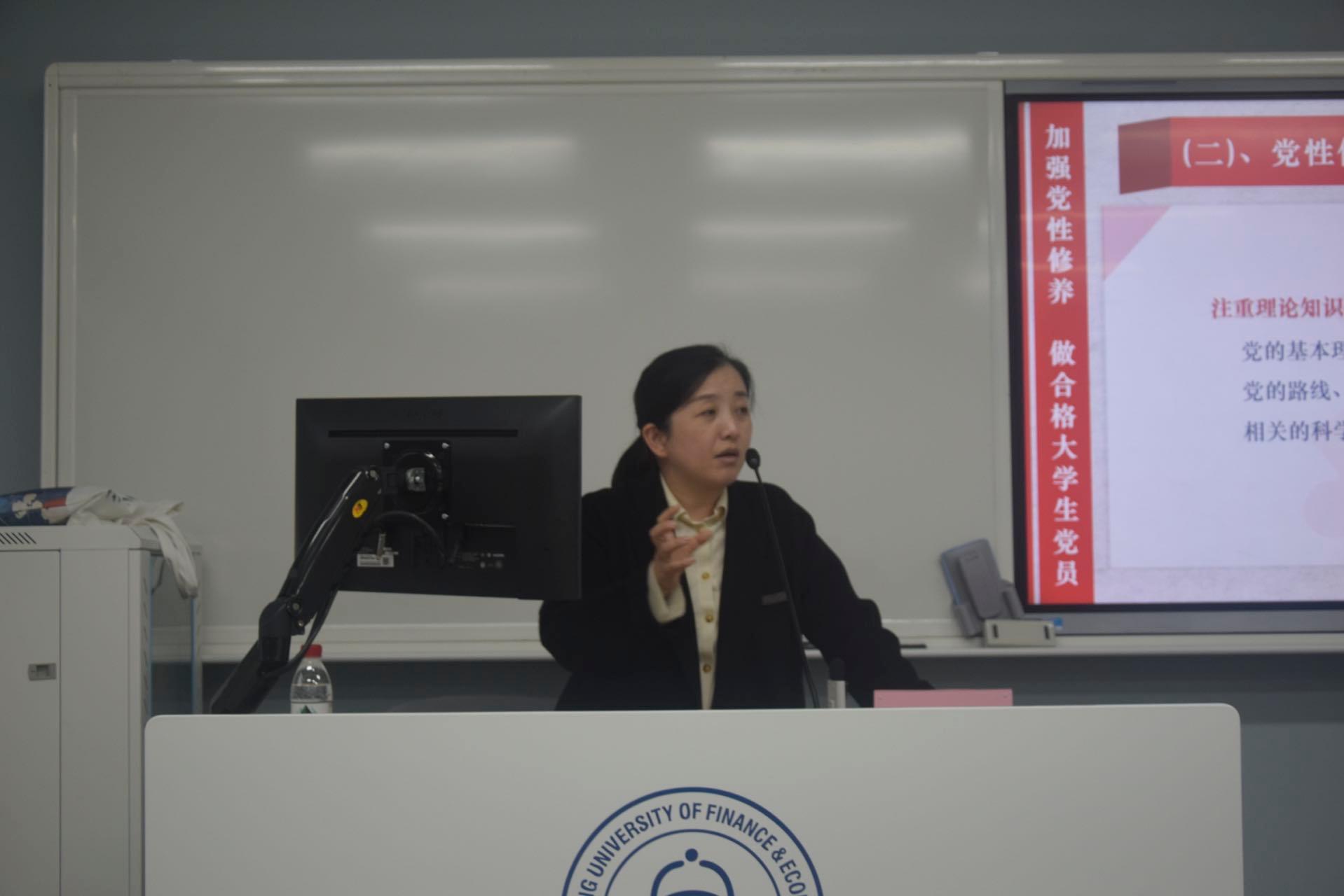人文学院党委书记高燕老师围绕“提升党性修养,做合格大学生党员”,从党性修养危机和提升党性修养具体内容两方面做具体阐述。高燕老师分析了党性修养危机产生的原因,举例“洁洁良”事件,告诫广大青年党员需要树立正确的三观和爱国主义情怀,注意在网络空间的言行举止;详细说明了提升党性修养的具体方法,包括端正入党动机、修养重在自觉。