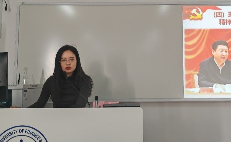 学生第五党支部书记毛立晨以“和总书记学坚定理想信念“为题,告诉大家走在绝境中,人生道路才能走得越来越宽阔,以习主席的亲身经历以及其他领导人的经历为例让同学们深入了解主题,通过介绍长征的胜利告诉同学们心中要有信仰,强调理想信念的重要性。