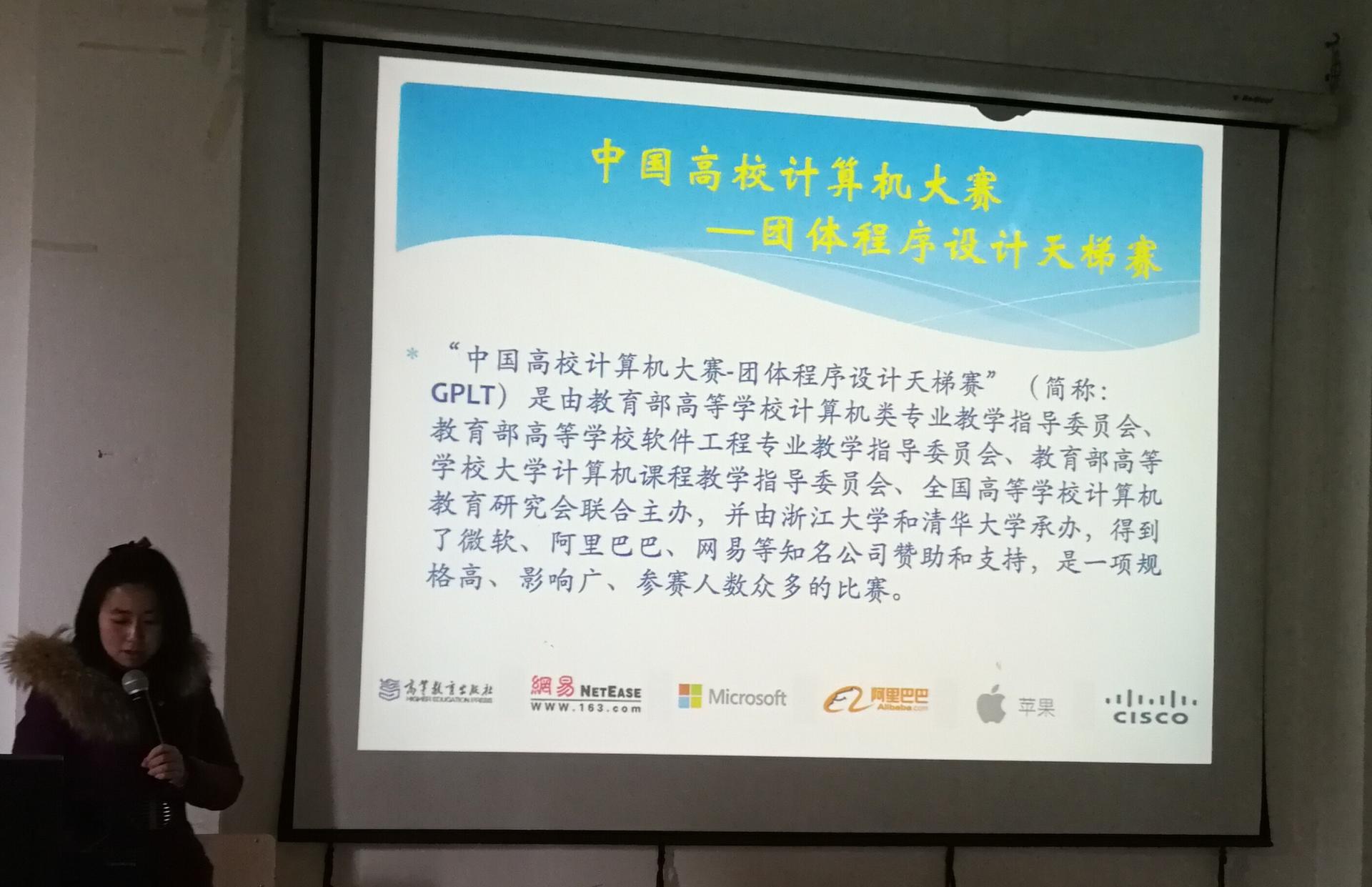 最后,朱凌老师还向同学们介绍了与天梯赛相关的程序设计能力考试PAT,以及考试网站和配套的学习资源,并以鼓励动员同学们踊跃报名积极参赛——2018,新时代,新征程,我们“撸起袖子,加油干! ”