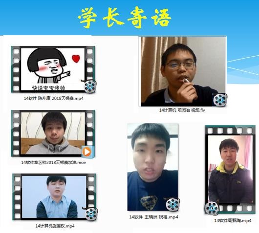 此外,在朱凌老师的邀请下,几位大四的学长录制了精彩的“学长寄语”(视频),他们作为资深的天梯斗士分别向学弟学妹们介绍了各自丰富的学习经验,鼓励和祝福即将参加选拔赛的新同学,为他们加油打劲。