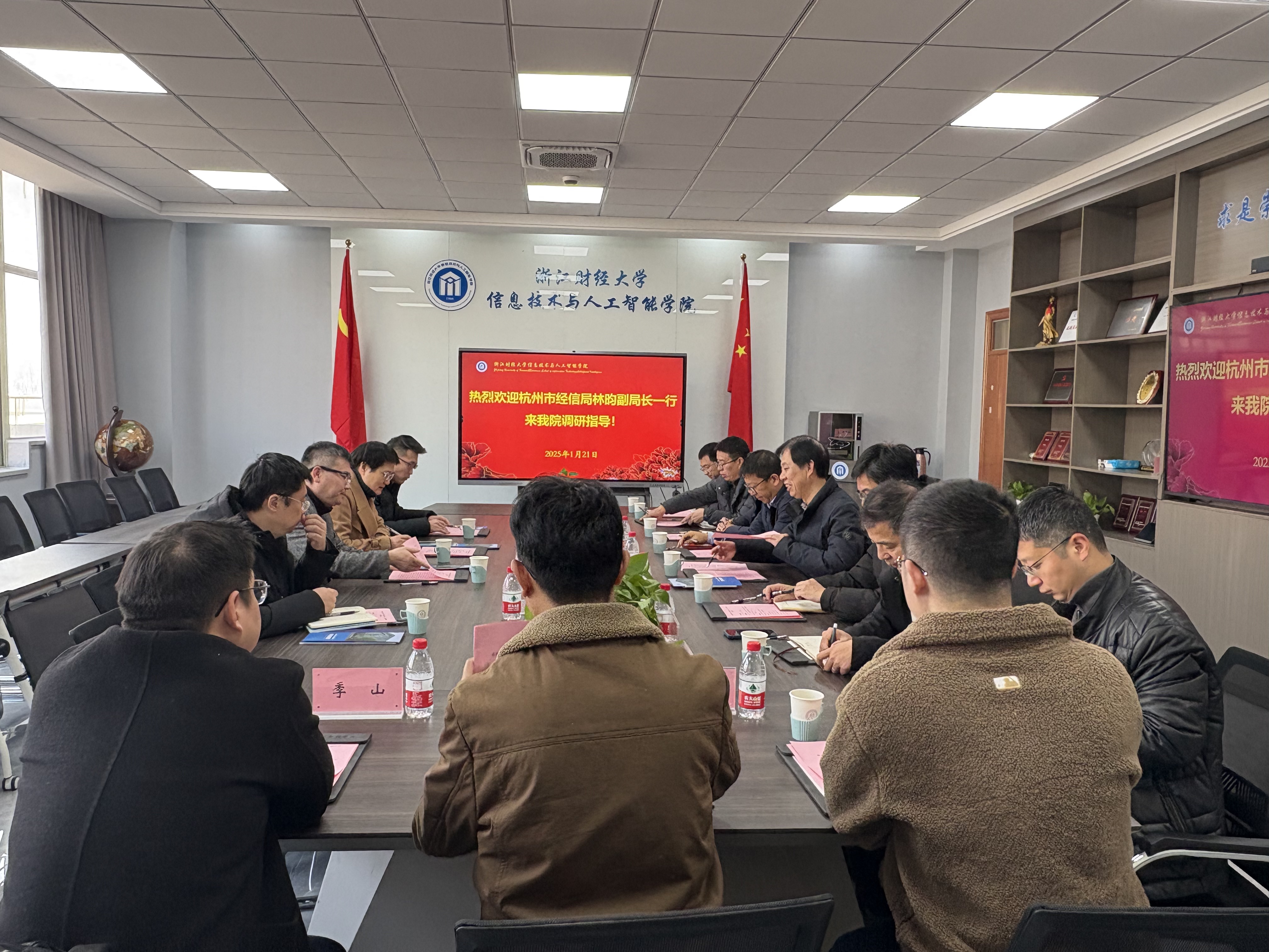 市经信局一行对学院取得的成绩表示赞许,并充分肯定了在人才培养、院企合作、服务地方等方面取得的成果。调研组还介绍了杭州市在软件领域、人工智能领域的相关支持政策,并表达了希望加强“学校、企业、政府”间合作,促进高校与企业、政府深度融合。