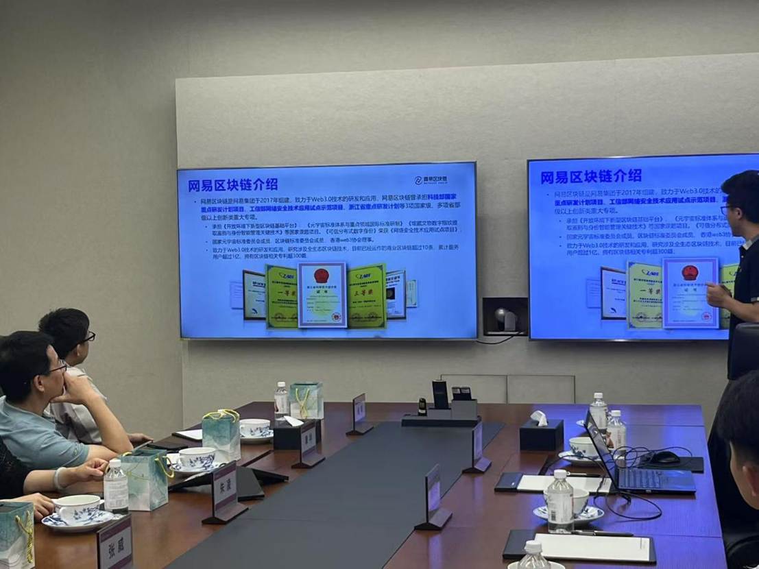副院长朱凌、实验中心主任章华、人工智能与金融科技研究所副所长张威、计算机系区块链方向骨干教师杨泽一行赴网易区块链进行参观访问。