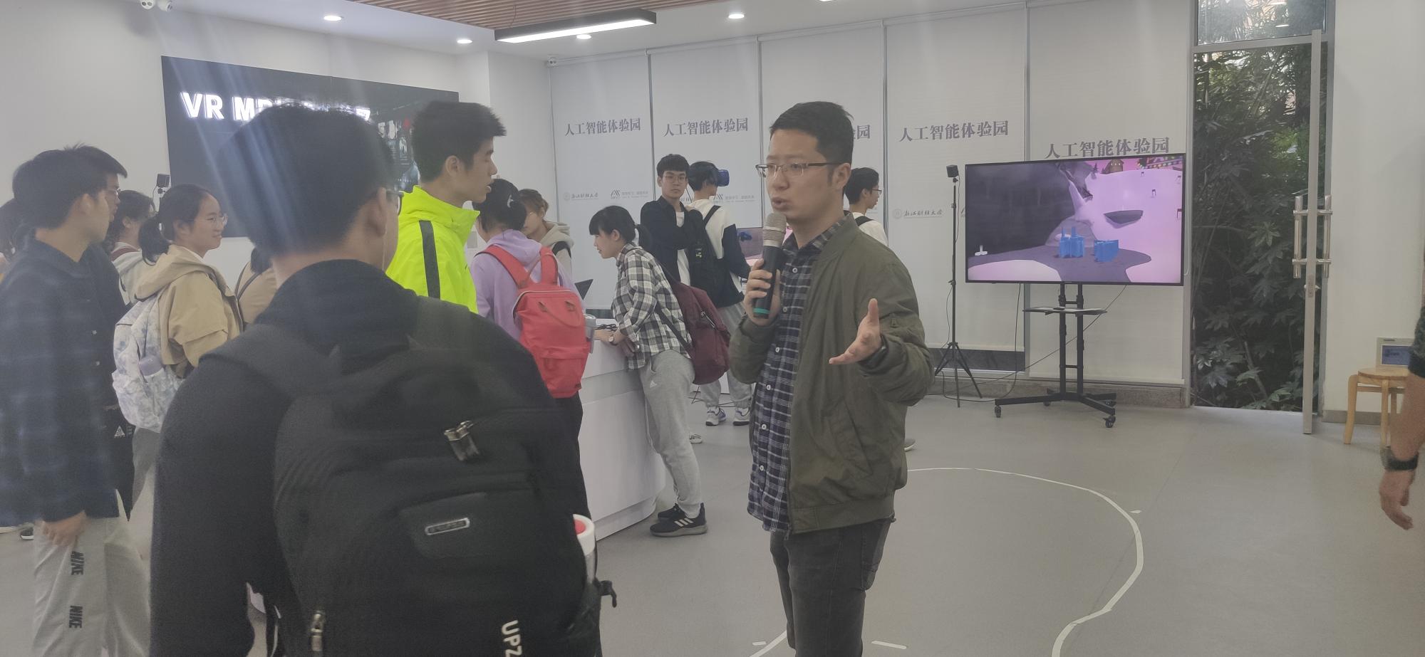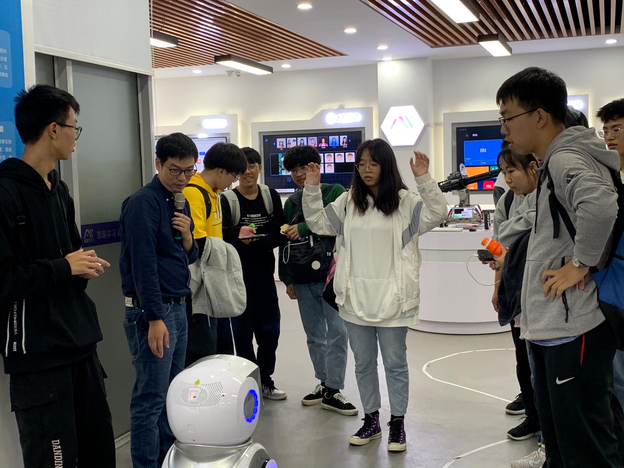 最后在讲解老师的带领下,依次参观了人工智能体验园和中心各个实验室。在体验园中同学们尝试人机对弈,辅以AlphaGo介绍了深度学习技术,随后分别体验了语音识别、视频融合、图像风格迁移、虚拟现实、自动驾驶等项目。在学院楼各个实验室参观过程中,讲解老师详细介绍了各个实验室功能、实验仪器设备、开设的实验课程与项目,并结合学生创新能力训练,实验室对各类学科竞赛和创新创业项目的支撑作了介绍。参观过程中,同学们对先进的设备、竞赛项目等表现出浓厚的兴趣,不时提出各种问题,讲解老师给予仔细解答。