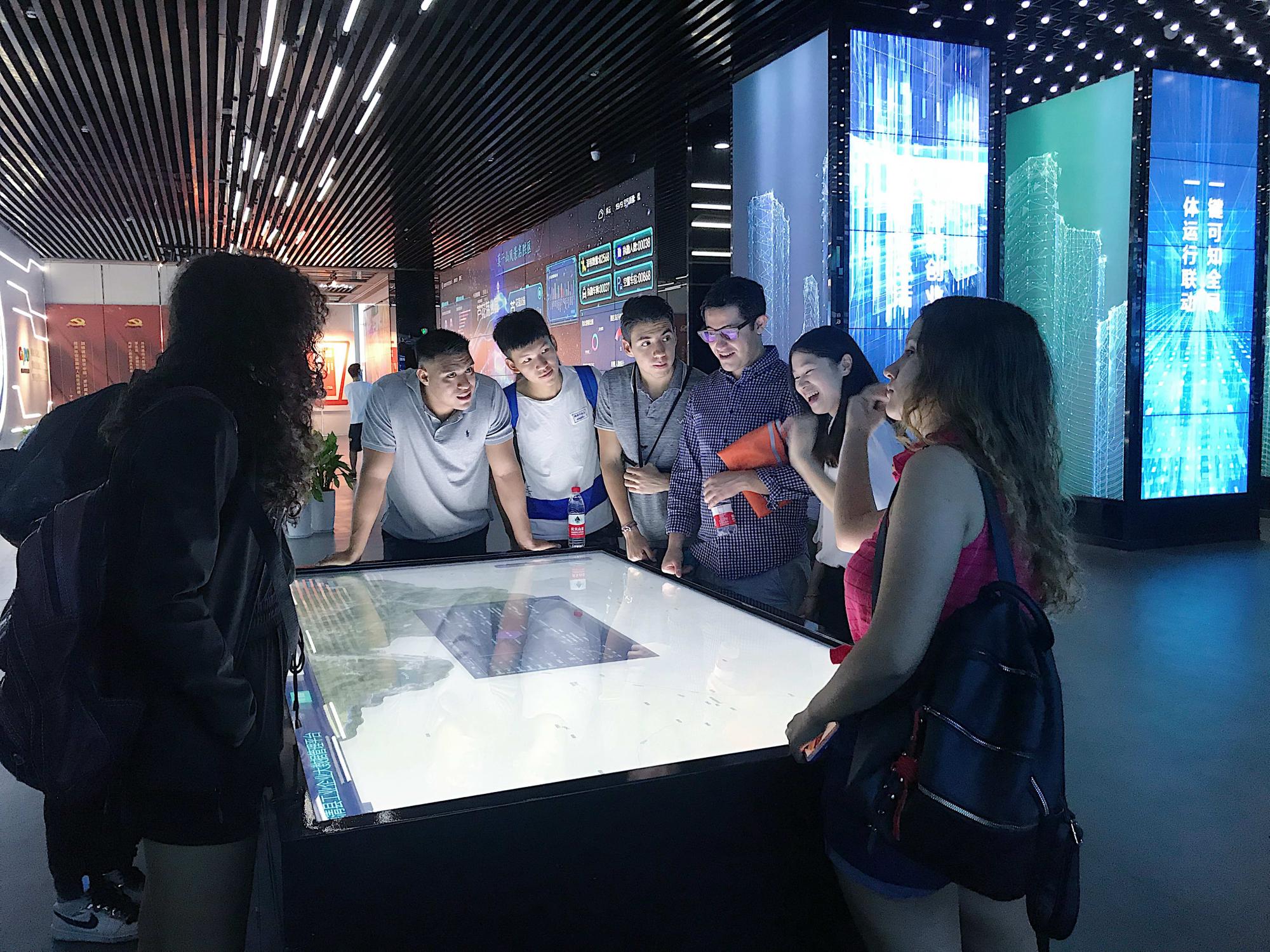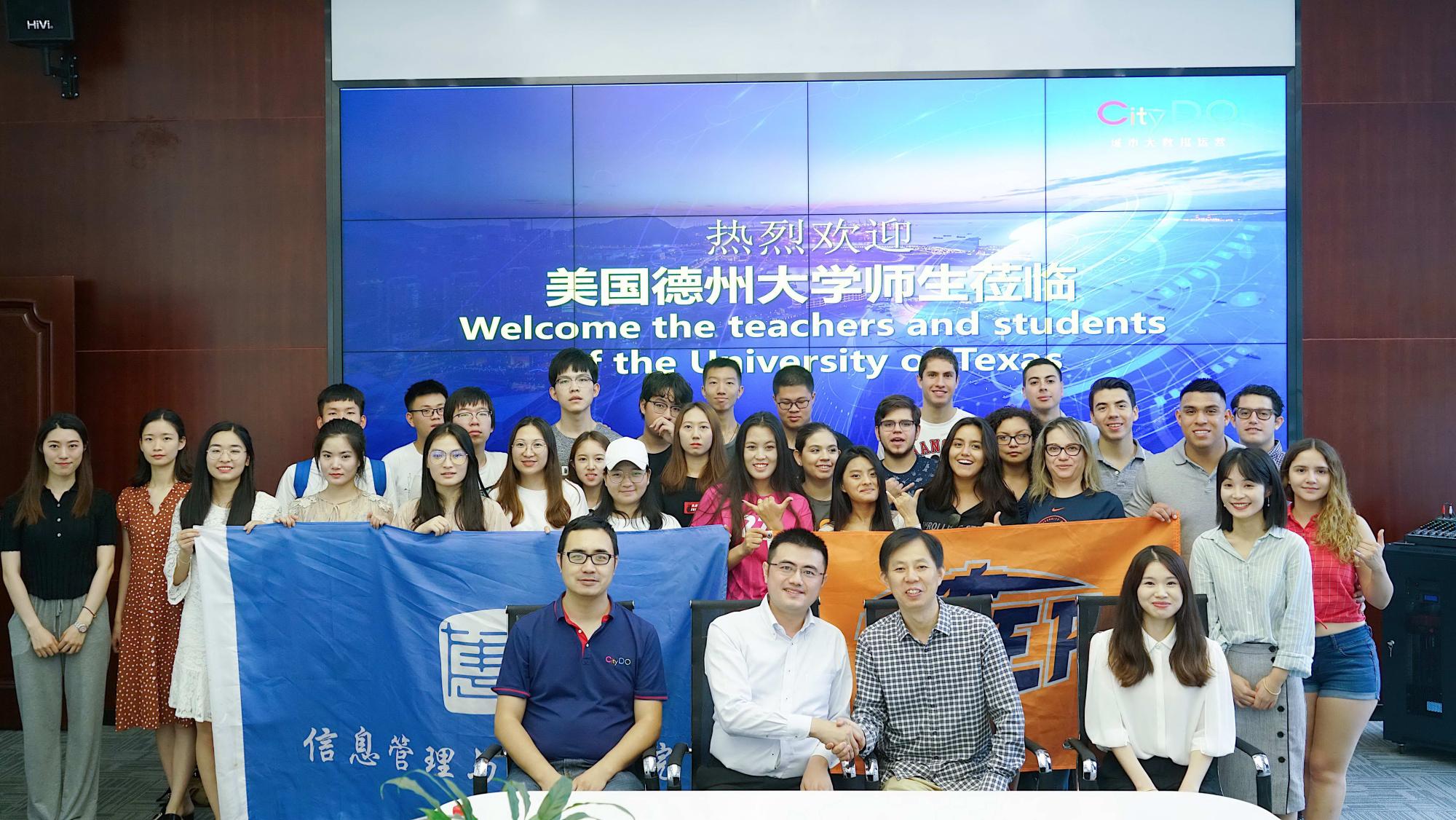 2019年7月10日星期三上午,在学院副院长张帅教授的带领下,商务智能中美暑期班的14名美国德州大学学生和16名信工学院学生参观了杭州城市大数据运营有限公司位于德清的智慧城市展示中心。