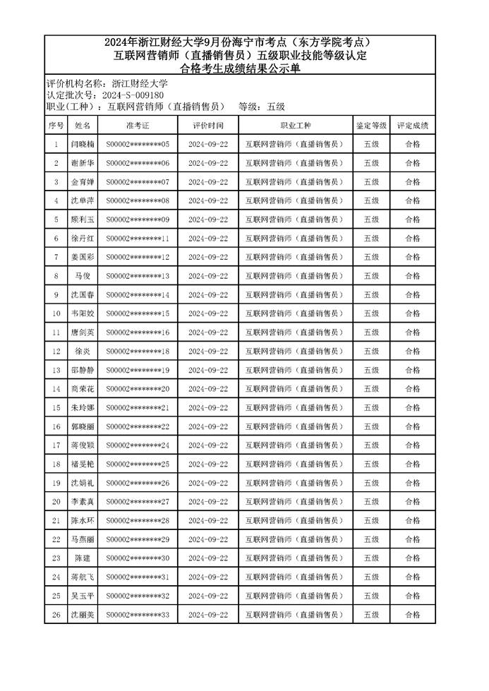 闫晓楠等共26名人员通过互联网营销师(直播销售员)五级理论和实操考核认定,成绩合格,现予以公示,接受监督。