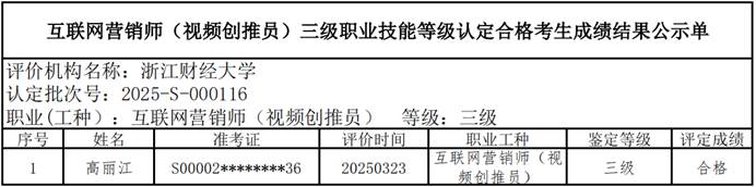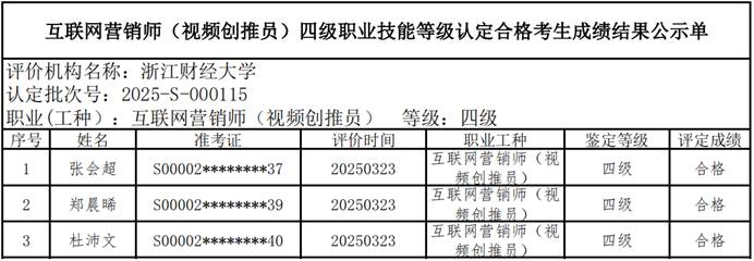 四、关于编号:2025-S-000116互联网营销师(视频创推员)三级职业技能等级认定成绩合格人员结果公示单
