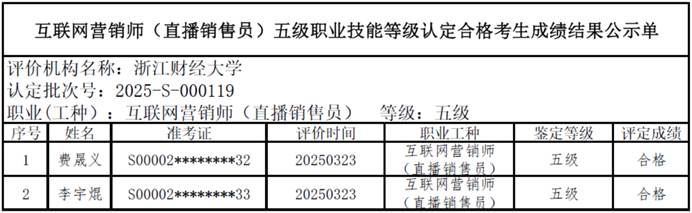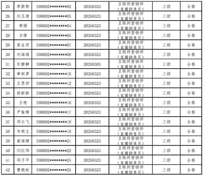 三、关于编号:2025-S-000119互联网营销师(直播销售员)五级职业技能等级认定成绩合格人员结果公示单