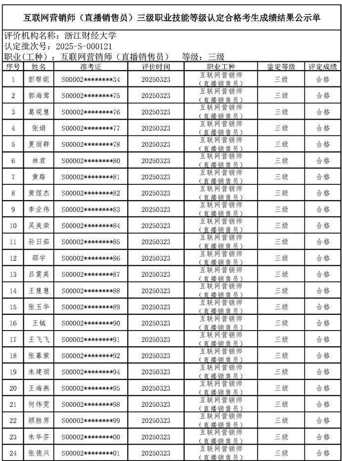 一、关于编号:2025-S-000121互联网营销师(直播销售员)三级职业技能等级认定成绩合格人员结果公示单