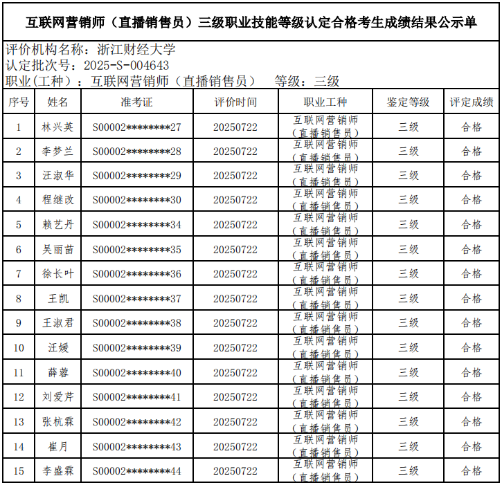 林兴英等共15名人员通过互联网营销师(直播销售员)三级理论和实操考核认定,成绩合格,现予以公示,接受监督。
